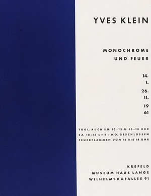 Exhibition Poster From January 14th to February 28, 1961, the Museum Haus Lange realized the first retrospective of Klein’s work in Germany. The left part of the poster shows a Monochrome in blue. The exhibition catalogue (as shown below) and the poster are linked and form a unity.