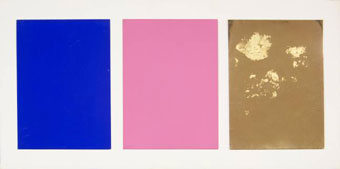 Monochrome und Feuer, 1961 Catalogue of the exhibition with two silkscreen in blue and rose, as well as a gold-plated board with gold leafs. This triptych has been created by Yves Klein as a enclosure to the catalogue of the exhibition and he himself put the gold leafts on the gold-plated board edition. Therefore these works are unique. |