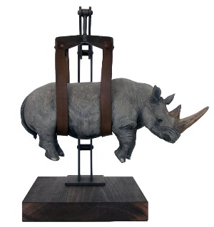 Original, 29 x 41 x 36 cm Edition of 8, signed and numbered Rhinoceros of resin hold by leather straps